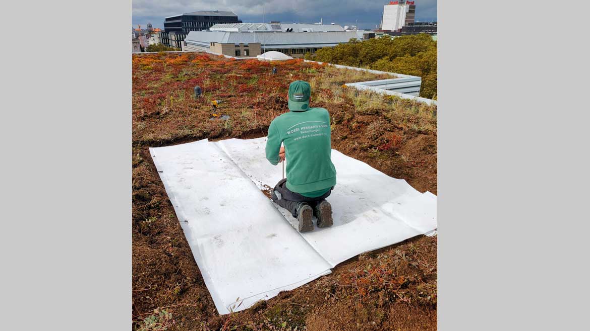 Wir tragen aktiv zur Gestaltung und Erhaltung der grünen Dächer in Städten bei, wie z.B. bei dieser Gründachwartung über den Dächern Düsseldorfs.