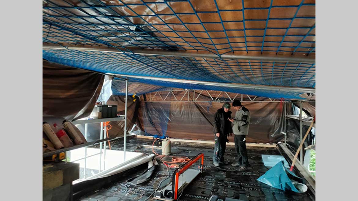 Bei bestem Wetter werden Fenster getauscht und Kamine neu eingezogen. Arbeitswetter wie man es sich nur wünschen kann.